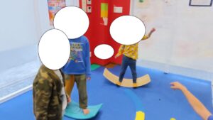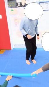 一本橋にはたくさんの邪魔者が登場・・集中力してバランスをとり姿勢保持と注意力を養います。